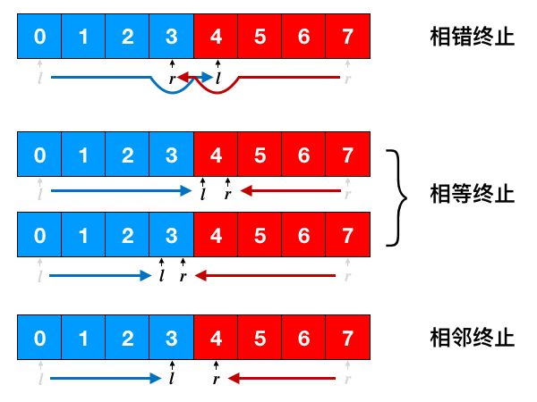 相错终止, 和 指针都处于负责区间外,处于湮灭状态, 才能恢复到有效区间,二分查找模板是从两端向中心扩散,所以指针运行反过来,,正好对应左加右减。